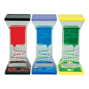 Color Drops Zig Zag with Single Wheel is a unique liquid timer that features a zig-zag pattern on one end and a wheel that spins on the other end. Turn over and watch the colored bubbles flow down the maze. Provides visual tracking and visual stimulation in one great unit. Made of durable plastic. Contents are non-toxic and non-flammable oils. Assorted colors, no color choice. 5 in high.